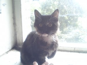 Отдам в добрые руки котенка (возраст 3-4 месяца). Девочка. Необычная окраска — черная с белыми носочками и рыжеватым напылением. Усы длиннющие!