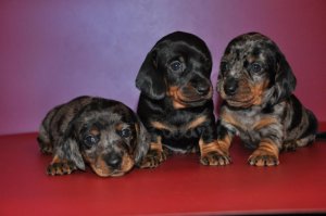 Продаем щенков таксы стандартной и миниатюрной гладкошерстной, д. р. 18 декабря 2012 г. Стандартные (небольшие) чёрно-мраморные мальчик и девочка с великолепной разбивкой мрамора; мелкий стандарт/ миниатюрная чёрно-подпалая яркая девочка; два рыжих мальчика и две рыжие девочки — мелкий стандарт или миниатюра. Отец щенков — обладатель ряда титулов, проверенный по потомству чёрно-мраморный, очень красивый миниатюрный кобель. Мать – некрупный стандарт, оценка на выставке «отлично», серебряная медаль охотничьей выставки. Щенки ласковые, контактные, с устойчивой психикой. Все документы РКФ, прививки. Цены разные. Много фото и все подробности — на нашем сайте.